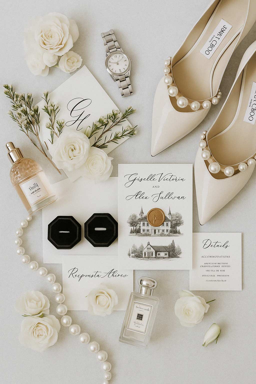 - Wedding Details in Form stilvoller Editorial Flatlays