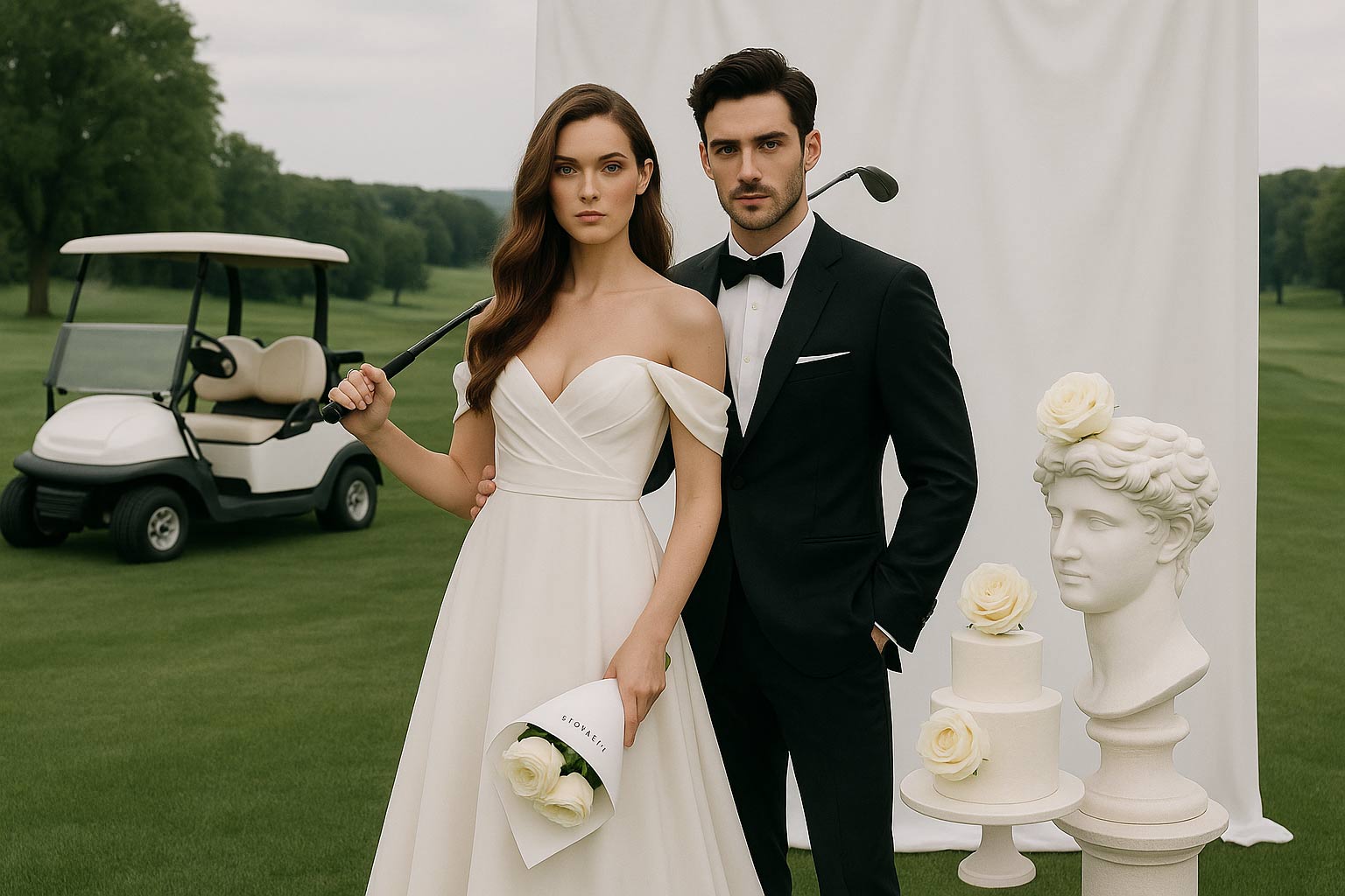 - Editorial Shooting auf dem Golfplatz mit einem Backdrop und Sweet Table
