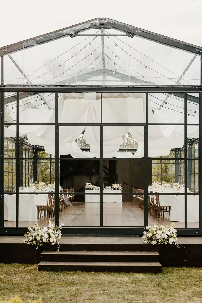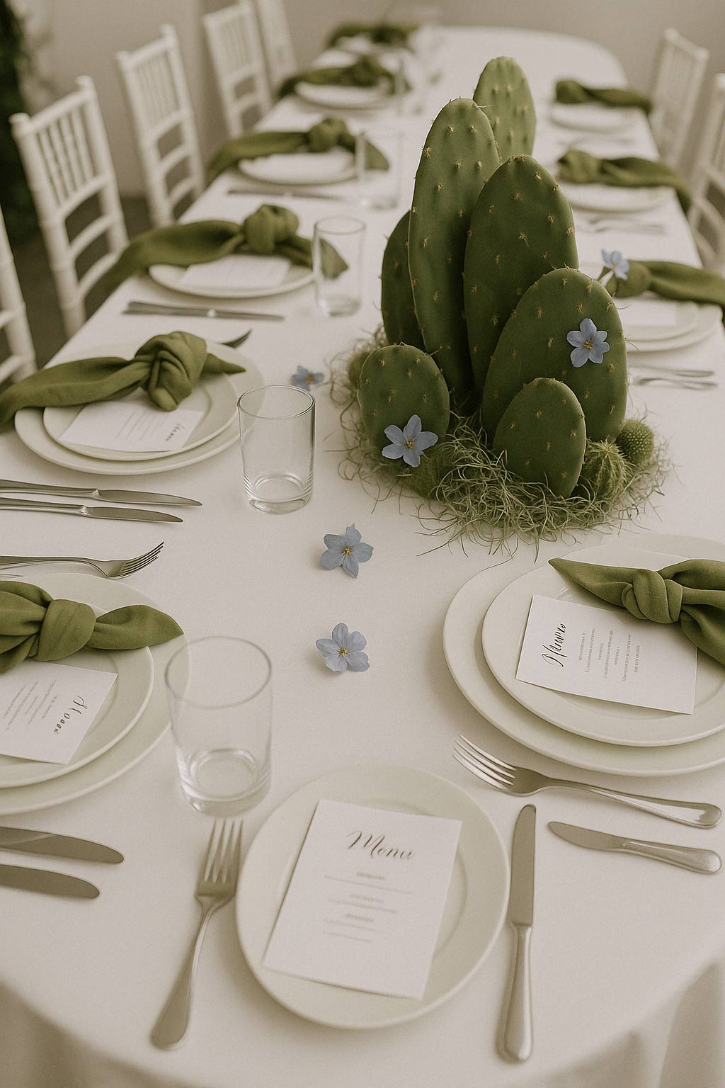 - Dinner Setting mit dekorierter Tafel, dem Brautpaar und jubelnden Gästen beim Anstoßen